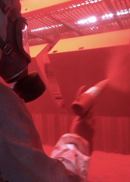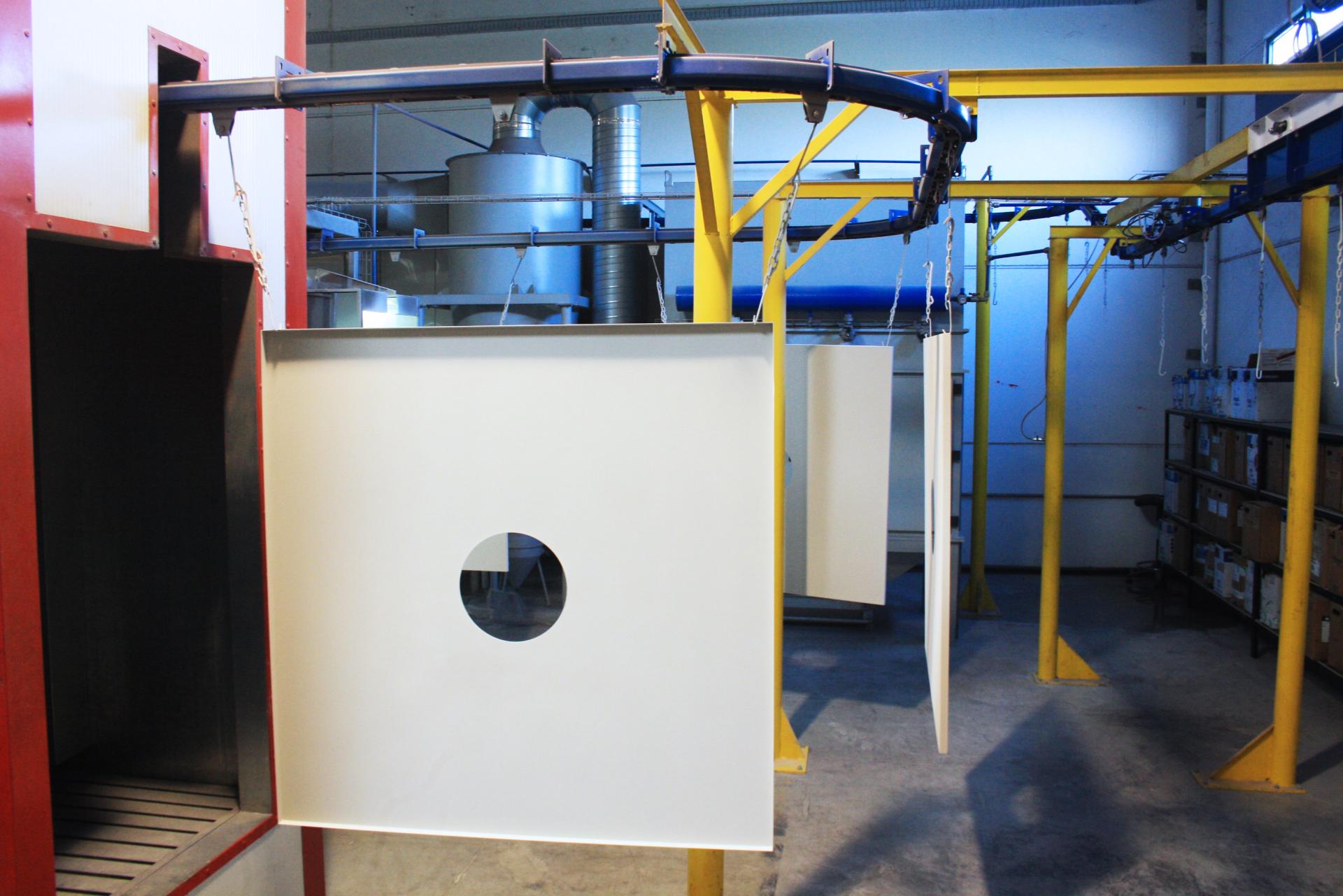 A secção de termolacagem é composta por uma unidade de pintura eletroestática a pó (exclusivamente para metais), com forno de polimerização.